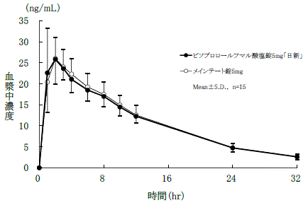 ビソプロロールフマル酸塩錠5mg「日新」とメインテート錠5mgを、クロスオーバー法によりそれぞれ1錠(ビソプロロールフマル酸塩として5mg)健康成人男子に絶食時単回経口投与して血漿中未変化体濃度を測定し、得られた薬物動態パラメータ(AUC、Cmax)について90%信頼区間法にて統計解析を行った結果、log(0.8)〜log(1.25)の範囲内であり、両製剤の生物学的同等性が確認された3) 。