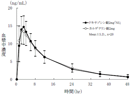 ドキサゾシン錠2mg「NS」とカルデナリン錠2mgを、クロスオーバー法によりそれぞれ1錠(ドキサゾシンとして2mg)健康成人男子に絶食時単回経口投与して血漿中未変化体濃度を測定し、得られた薬物動態パラメータ(AUC、Cmax)について90%信頼区間法にて統計解析を行った結果、log(0.8)~log(1.25)の範囲内であり、両製剤の生物学的同等性が確認された8) 。
