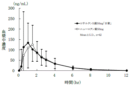 ロサルタンK錠50mg「日新」とニューロタン錠50mgを、クロスオーバー法によりそれぞれ1錠(ロサルタンカリウムとして50mg)健康成人男子に絶食時単回経口投与して血漿中未変化体濃度を測定し、得られた薬物動態パラメータ(AUC、Cmax)について90%信頼区間法にて統計解析を行った結果、log(0.80)~log(1.25)の範囲内であり、両製剤の生物学的同等性が確認された5) 。