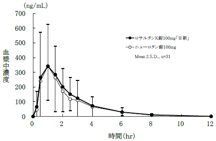ロサルタンK錠100mg「日新」とニューロタン錠100mgを、クロスオーバー法によりそれぞれ1錠(ロサルタンカリウムとして100mg)健康成人男子に絶食時単回経口投与して血漿中未変化体濃度を測定し、得られた薬物動態パラメータ(AUC、Cmax)について90%信頼区間法にて統計解析を行った結果、log(0.80)~log(1.25)の範囲内であり、両製剤の生物学的同等性が確認された6) 。
