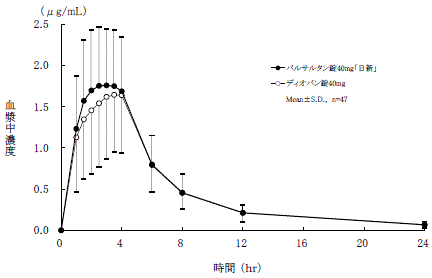 バルサルタン錠40mg「日新」とディオバン錠40mgを、クロスオーバー法によりそれぞれ1錠(バルサルタンとして40mg)健康成人男子に絶食時単回経口投与して血漿中未変化体濃度を測定し、得られた薬物動態パラメータ(AUC、Cmax)について90%信頼区間法にて統計解析を行った結果、log(0.80)~log(1.25)の範囲内であり、両製剤の生物学的同等性が確認された6) 。
