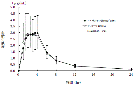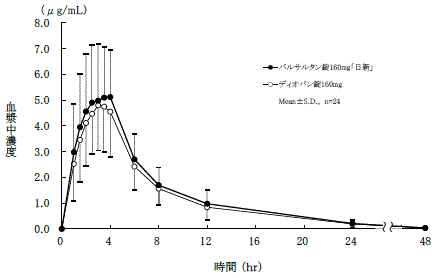 バルサルタン錠160mg「日新」とディオバン錠160mgを、クロスオーバー法によりそれぞれ1錠(バルサルタンとして160mg)健康成人男子に絶食時単回経口投与して血漿中未変化体濃度を測定し、得られた薬物動態パラメータ(AUC、Cmax)について90%信頼区間法にて統計解析を行った結果、log(0.80)~log(1.25)の範囲内であり、両製剤の生物学的同等性が確認された8) 。