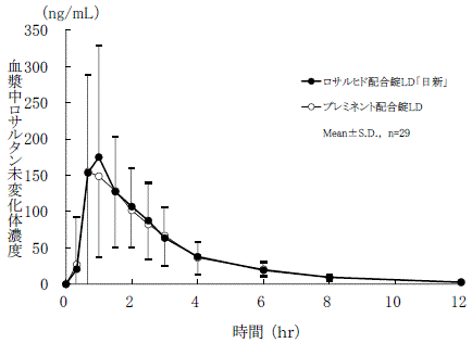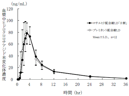 ロサルヒド配合錠LD「日新」とプレミネント配合錠LDを、クロスオーバー法によりそれぞれ1錠(ロサルタンカリウムとして50mg及びヒドロクロロチアジドとして12.5mg)健康成人男子に絶食時単回経口投与して、ロサルタンカリウム及びヒドロクロロチアジドの血漿中未変化体濃度を測定し、得られた薬物動態パラメータ(AUC、Cmax)について統計解析を行った結果、両製剤の生物学的同等性が確認された9) 。