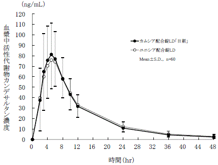 カムシア配合錠LD「日新」とユニシア配合錠LDを、クロスオーバー法によりそれぞれ1錠(カンデサルタン シレキセチルとして8mg及びアムロジピンとして2.5mg)健康成人男子に絶食時単回経口投与して、活性代謝物カンデサルタンの血漿中濃度を測定し、得られた薬物動態パラメータ(AUC、Cmax)について90%信頼区間法にて統計解析を行った結果、log(0.80)〜log(1.25)の範囲内であり、両製剤の生物学的同等性が確認された5) 。