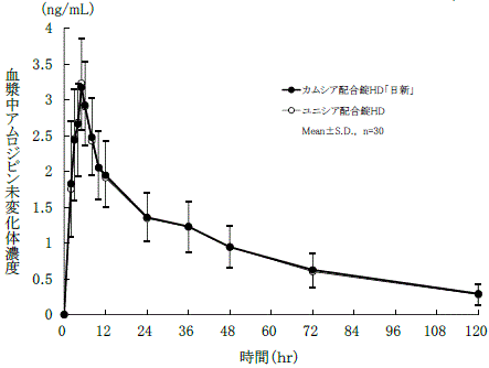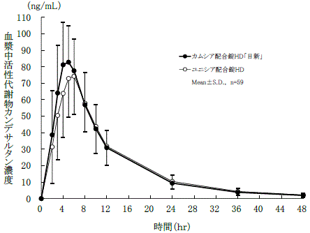 カムシア配合錠HD「日新」とユニシア配合錠HDを、クロスオーバー法によりそれぞれ1錠(カンデサルタン シレキセチルとして8mg及びアムロジピンとして5mg)健康成人男子に絶食時単回経口投与して、活性代謝物カンデサルタン及びアムロジピン未変化体の血漿中濃度を測定し、得られた薬物動態パラメータ(AUC、Cmax)について90%信頼区間法にて統計解析を行った結果、カンデサルタン及びアムロジピンともlog(0.80)〜log(1.25)の範囲内であり、両製剤の生物学的同等性が確認された6) 。