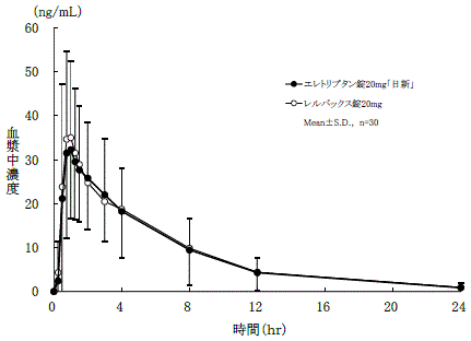 エレトリプタン錠20mg「日新」とレルパックス錠20mgを、クロスオーバー法によりそれぞれ1錠(エレトリプタンとして20mg)健康成人男子に絶食時単回経口投与して血漿中未変化体濃度を測定し、得られた薬物動態パラメータ(AUC、Cmax)について90%信頼区間法にて統計解析を行った結果、log(0.80)~log(1.25)の範囲内であり、両製剤の生物学的同等性が確認された4) 。