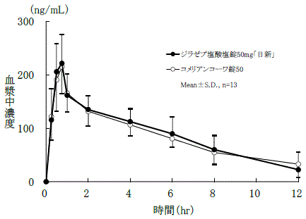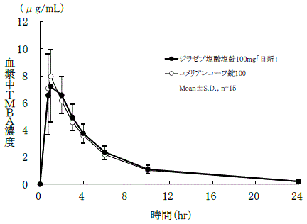 ジラゼプ塩酸塩錠100mg「日新」とコメリアンコーワ錠100を、クロスオーバー法によりそれぞれ1錠(ジラゼプ塩酸塩水和物として100mg)健康成人男子に絶食時単回経口投与して代謝物3,4,5-trimethoxybenzoic acid(TMBA)の血漿中濃度を測定し、得られた薬物動態パラメータ(AUC、Cmax)について統計解析を行った結果、両製剤の生物学的同等性が確認された2) 。