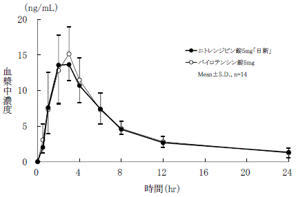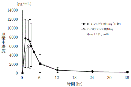 二トレンジピン錠5mg「日新」とバイロテンシン錠5mgを、クロスオーバー法によりそれぞれ2錠(ニトレンジピンとして10mg)健康成人男子に絶食時単回経口投与して血漿中未変化体濃度を測定し、得られた薬物動態パラメータ(AUC、Cmax)について統計解析を行った結果、両製剤の生物学的同等性が確認された3) 。