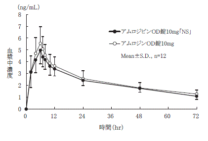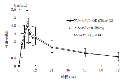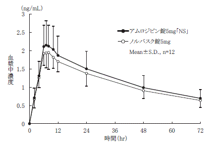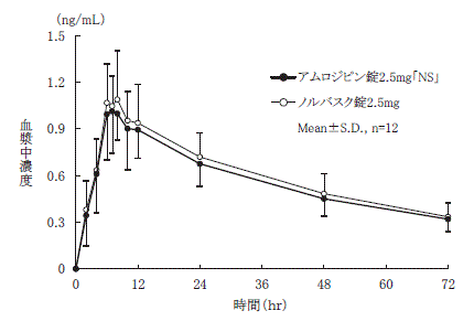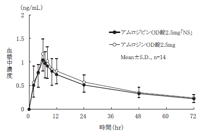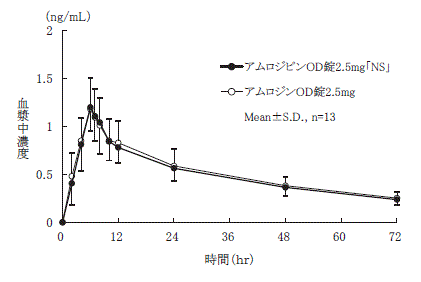アムロジピン錠2.5mg「NS」とノルバスク錠2.5mgを、クロスオーバー法によりそれぞれ1錠(アムロジピンとして2.5mg)健康成人男子に絶食時単回経口投与して血漿中未変化体濃度を測定し、得られた薬物動態パラメータ(AUC、Cmax)について90%信頼区間法にて統計解析を行った結果、log(0.8)~log(1.25)の範囲内であり、両製剤の生物学的同等性が確認された8) 。