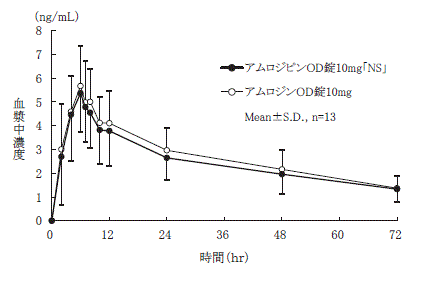 アムロジピン錠10mg「NS」は、「含量が異なる経口固形製剤の生物学的同等性試験ガイドライン(平成18年11月24日 薬食審査発第1124004号)」に基づき、アムロジピン錠5mg「NS」を標準製剤としたとき、溶出挙動が同等と判断され、生物学的に同等とみなされた18) 。