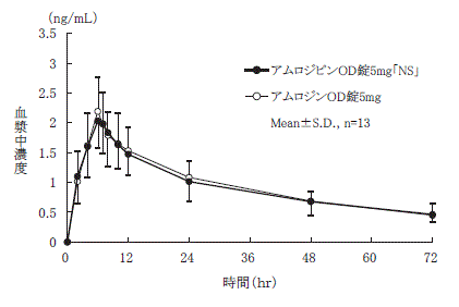 アムロジピンOD錠2.5mg「NS」とアムロジンOD錠2.5mgを、クロスオーバー法によりそれぞれ1錠(アムロジピンとして2.5mg)健康成人男子に絶食時単回経口投与(水で服用及び水なしで服用)して血漿中未変化体濃度を測定し、得られた薬物動態パラメータ(AUC、Cmax)について90%信頼区間法にて統計解析を行った結果、log(0.80)~log(1.25)の範囲内であり、両製剤の生物学的同等性が確認された8) 。