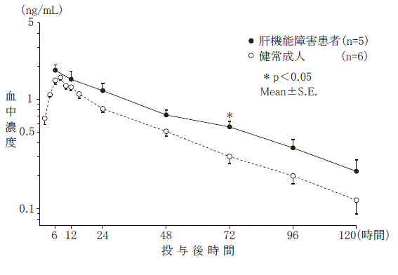 成人肝硬変患者(Child分類A、B)5例にアムロジピンとして2.5mgを単回投与した場合の血中濃度推移並びに薬物動態パラメータは図及び表の通りである。健康成人に比し、投与72時間後の血中濃度が有意に上昇し、T1/2、AUCはやや高値を示したが有意差は認められなかった14) 。