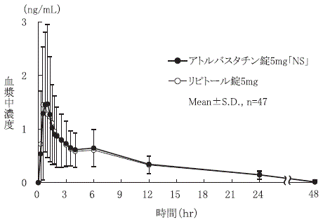 健康成人6例に、アトルバスタチン5注1) 、10、20及び40mgを絶食下単回経口投与した結果、血漿中未変化体のCmax及びAUC0-∞は投与量に比例して増加し、Tmax及び半減期はほぼ一定であったことから、アトルバスタチンの体内動態は線形性を示すと考えられた1) 。なお、日本人と外国人との体内動態を比較した結果、個人差を上回る人種差は認められなかった2) 。