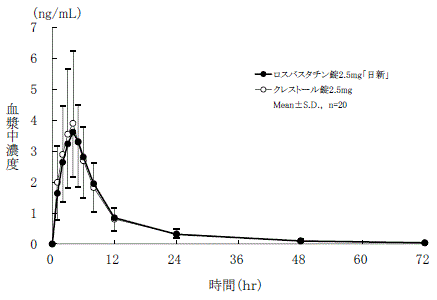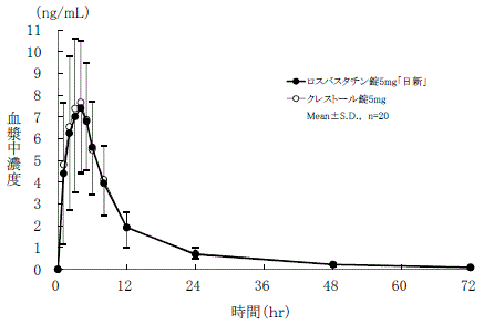 ロスバスタチン錠5mg「日新」とクレストール錠5mgを、クロスオーバー法によりそれぞれ1錠(ロスバスタチンとして5mg)健康成人男子に絶食時単回経口投与して血漿中未変化体濃度を測定し、得られた薬物動態パラメータ(AUC、Cmax)について90%信頼区間法にて統計解析を行った結果、log(0.80)~log(1.25)の範囲内であり、両製剤の生物学的同等性が確認された6) 。