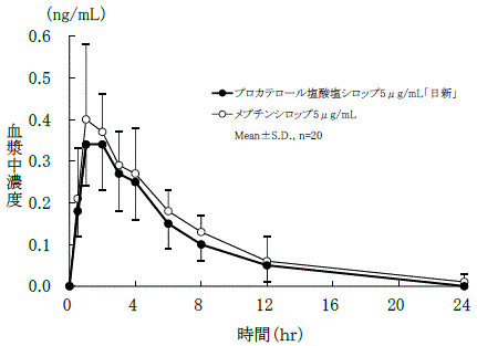 プロカテロール塩酸塩シロップ5μg/mL「日新」とメプチンシロップ5μg/mLを、クロスオーバー法によりそれぞれ20mL(プロカテロール塩酸塩水和物として100μg注1) )健康成人男子に絶食時単回経口投与して血漿中未変化体濃度を測定し、得られた薬物動態パラメータ(AUC、Cmax)について統計解析を行った結果、両製剤の生物学的同等性が確認された4) 。