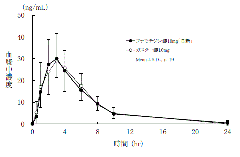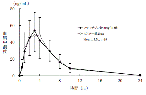 ファモチジン錠20mg「日新」とガスター錠20mgを、クロスオーバー法によりそれぞれ1錠(ファモチジンとして20mg)健康成人男子に絶食時単回経口投与して血漿中未変化体濃度を測定し、得られた薬物動態パラメータ(AUC、Cmax)について90%信頼区間法にて統計解析を行った結果、log(0.8)~log(1.25)の範囲内であり、両製剤の生物学的同等性が確認された5) 。
