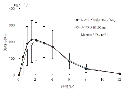 レバミピド錠100mg「NS」とムコスタ錠100mgを、クロスオーバー法によりそれぞれ1錠(レバミピドとして100mg)健康成人男子に絶食時単回経口投与して血漿中未変化体濃度を測定し、得られた薬物動態パラメータ(AUC、Cmax)について90%信頼区間法にて統計解析を行った結果、log(0.8)~log(1.25)の範囲内であり、両製剤の生物学的同等性が確認された2) 。