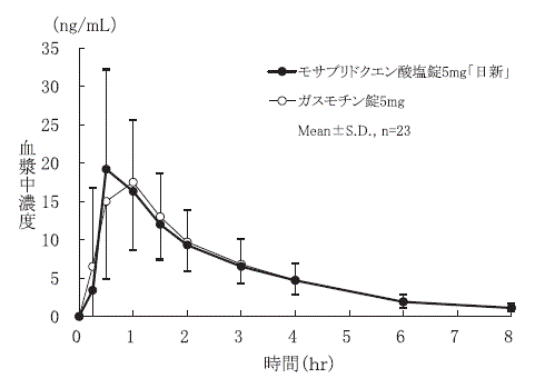 モサプリドクエン酸塩錠5mg「日新」とガスモチン錠5mgを、クロスオーバー法によりそれぞれ1錠(モサプリドクエン酸塩として5mg)健康成人男子に絶食時単回経口投与して血漿中未変化体濃度を測定し、得られた薬物動態パラメータ(AUC、Cmax)について90%信頼区間法にて統計解析を行った結果、log(0.80)~log(1.25)の範囲内であり、両製剤の生物学的同等性が確認された3) 。