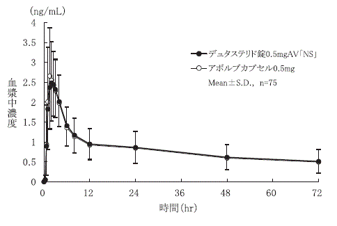 前立腺肥大症患者にデュタステリド0.05~2.5mg注1)を1日1回6ヵ月間反復経口投与した時、0.5mgではおよそ投与5ヵ月で定常状態に達し、6ヵ月での血清中薬物濃度は44.82±17.91ng/mLであった。0.5mg投与の定常状態におけるt1/2は3.4±1.2週間であり、消失は非線形であった5)。