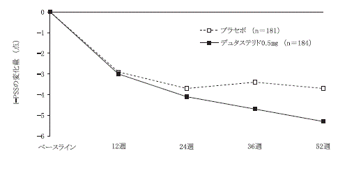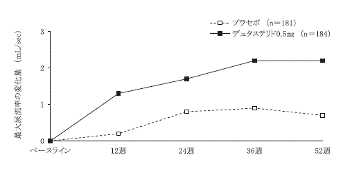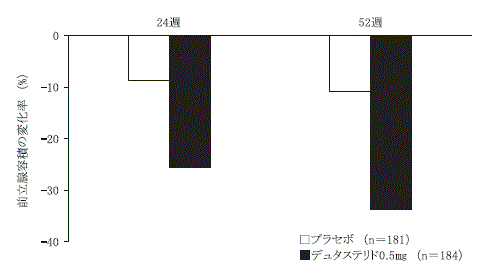 前立腺体積30mL以上の前立腺肥大症患者を対象とした二重盲検比較試験(1日1回52週間経口投与)20) において、デュタステリド0.5mgはプラセボに比し、I-PSS及び最大尿流率を有意に改善し、前立腺体積を有意に減少させた21) 。