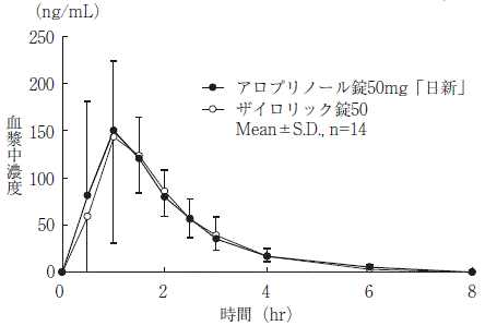 アロプリノール錠50mg「日新」とザイロリック錠50を、クロスオーバー法によりそれぞれ1錠(アロプリノールとして50mg)健康成人男子に絶食時単回経口投与して血漿中未変化体濃度を測定し、得られた薬物動態パラメータ(AUC、Cmax)について90%信頼区間法にて統計解析を行った結果、log(0.80)~log(1.25)の範囲内であり、両製剤の生物学的同等性が確認された7) 。