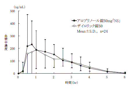 アロプリノール錠50mg「NS」とザイロリック錠50を、クロスオーバー法によりそれぞれ1錠(アロプリノールとして50mg)健康成人男子に絶食時単回経口投与して血漿中未変化体濃度を測定し、得られた薬物動態パラメータ(AUC、Cmax)について統計解析を行った結果、AUCについては対数値の平均値の差の90%信頼区間がlog(0.80)~log(1.25)の範囲内であり、Cmaxについては対数値の平均値の差がlog(0.90)~log(1.11)で、かつ、溶出試験で規定するすべての条件で溶出挙動が類似していたことから、両製剤の生物学的同等性が確認された7) 。
