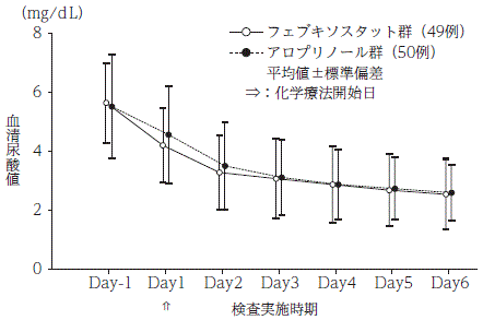 化学療法施行予定の悪性腫瘍患者99例を対象にアロプリノール対照非盲検無作為化比較試験を行った。フェブキソスタット60mg/日又はアロプリノールは300mg/日[腎機能障害のある患者(30≦eGFR<45mL/min/1.73m2)では200mg/日]を化学療法施行開始24時間前から6日間投与した。投与開始6日後までの血清尿酸値AUC(主要評価項目)は、アロプリノール群に対するフェブキソスタット群の非劣性が示された(非劣性マージンは150mg・h/dL)。また、フェブキソスタット60mg/日の投与により血清尿酸値は投与開始6日後まで経時的に減少した31),32) 。本試験におけるフェブキソスタット60mg/日の安全性評価対象49例中1例(2.0%)に副作用が認められた。その副作用は、AST増加、ALT増加であった 。