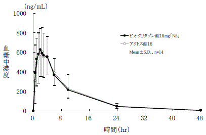 ピオグリタゾン錠15mg「NS」とアクトス錠15を、クロスオーバー法によりそれぞれ1錠(ピオグリタゾンとして15mg)健康成人男子に絶食時単回経口投与して血漿中未変化体濃度を測定し、得られた薬物動態パラメータ(AUC、Cmax)について90%信頼区間法にて統計解析を行った結果、log(0.80)~log(1.25)の範囲内であり、両製剤の生物学的同等性が確認された8) 。