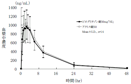 ピオグリタゾン錠30mg「NS」とアクトス錠30を、クロスオーバー法によりそれぞれ1錠(ピオグリタゾンとして30mg)健康成人男子に絶食時単回経口投与して血漿中未変化体濃度を測定し、得られた薬物動態パラメータ(AUC、Cmax)について90%信頼区間法にて統計解析を行った結果、log(0.80)~log(1.25)の範囲内であり、両製剤の生物学的同等性が確認された9) 。