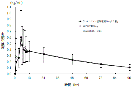 ラロキシフェン塩酸塩錠60mg「日新」とエビスタ錠60mgを、クロスオーバー法によりそれぞれ1錠(ラロキシフェン塩酸塩として60mg)閉経後健康女性に絶食時単回経口投与して血漿中未変化体濃度を測定し、得られた薬物動態パラメータ(AUC、Cmax)について90%信頼区間法にて統計解析を行った結果、log(0.80)~log(1.25)の範囲内であり、両製剤の生物学的同等性が確認された6) 。