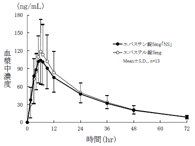 エバスチン錠5mg「NS」とエバステル錠5mgを、クロスオーバー法によりそれぞれ2錠(エバスチンとして10mg)健康成人男子に絶食時単回経口投与して活性代謝物カレバスチンの血漿中濃度を測定し、得られた薬物動態パラメータ(AUC、Cmax)について90%信頼区間法にて統計解析を行った結果、log(0.8)~log(1.25)の範囲内であり、両製剤の生物学的同等性が確認された1) 。