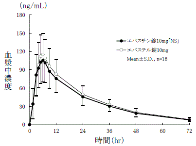 エバスチン錠10mg「NS」とエバステル錠10mgを、クロスオーバー法によりそれぞれ1錠(エバスチンとして10mg)健康成人男子に絶食時単回経口投与して活性代謝物カレバスチンの血漿中濃度を測定し、得られた薬物動態パラメータ(AUC、Cmax)について90%信頼区間法にて統計解析を行った結果、log(0.8)~log(1.25)の範囲内であり、両製剤の生物学的同等性が確認された2) 。