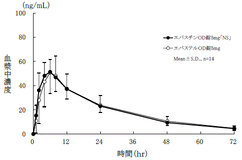 エバスチンOD錠5mg「NS」とエバステルOD錠5mgを、クロスオーバー法によりそれぞれ1錠(エバスチンとして5mg)健康成人男子に絶食時単回経口投与(水で服用及び水なしで服用)して活性代謝物カレバスチンの血漿中濃度を測定し、得られた薬物動態パラメータ(AUC、Cmax)について90%信頼区間法にて統計解析を行った結果、log(0.80)~log(1.25)の範囲内であり、両製剤の生物学的同等性が確認された3) 。