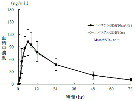 エバスチンOD錠10mg「NS」とエバステルOD錠10mgを、クロスオーバー法によりそれぞれ1錠(エバスチンとして10mg)健康成人男子に絶食時単回経口投与(水で服用及び水なしで服用)して活性代謝物カレバスチンの血漿中濃度を測定し、得られた薬物動態パラメータ(AUC、Cmax)について90%信頼区間法にて統計解析を行った結果、log(0.80)~log(1.25)の範囲内であり、両製剤の生物学的同等性が確認された4) 。