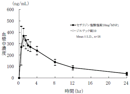 セチリジン塩酸塩錠5mg「MNP」とジルテック錠5を、クロスオーバー法によりそれぞれ2錠(セチリジン塩酸塩として10mg)健康成人男子に絶食時単回経口投与して血漿中未変化体濃度を測定し、得られた薬物動態パラメータ(AUC、Cmax)について90%信頼区間法にて統計解析を行った結果、log(0.8)~log(1.25)の範囲内であり、両製剤の生物学的同等性が確認された3) 。