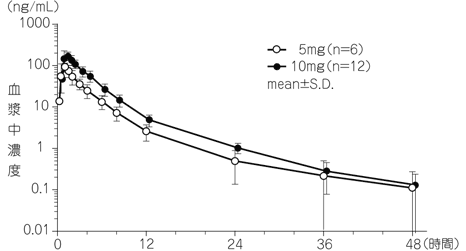 健康成人男性にオロパタジン塩酸塩錠5mg及び10mgを絶食下単回経口投与したときの血漿中濃度推移及び薬物動態パラメータは以下のとおりであった1)。