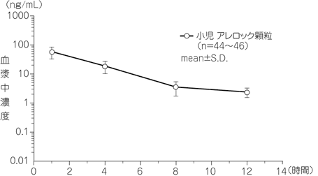 小児アレルギー患者(2~6歳、91例)にアレロック顆粒0.5g(オロパタジン塩酸塩として2.5mg)を1日2回14日間反復経口投与した。定常状態で各患児から1~2時点を採血したときの血漿中濃度推移は以下のとおりであった3)。