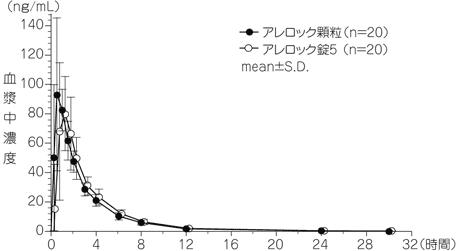 健康成人男性にアレロック顆粒1g(オロパタジン塩酸塩として5mg)又はアレロック錠5を絶食下にて水とともに単回経口投与したときの血漿中濃度推移及び薬物動態パラメータは以下のとおりであり、生物学的に同等であることが確認された4)。