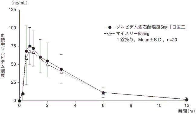 ゾルピデム酒石酸塩錠5mg「日医工」及びマイスリー錠5mgを、クロスオーバー法によりそれぞれ1錠(ゾルピデム酒石酸塩として5mg)健康成人男子に絶食単回経口投与して血漿中ゾルピデム濃度を測定し、得られた薬物動態パラメータ(AUC、Cmax)について90%信頼区間法にて統計解析を行った結果、log(0.8)~log(1.25)の範囲内であり、両剤の生物学的同等性が確認された2)。