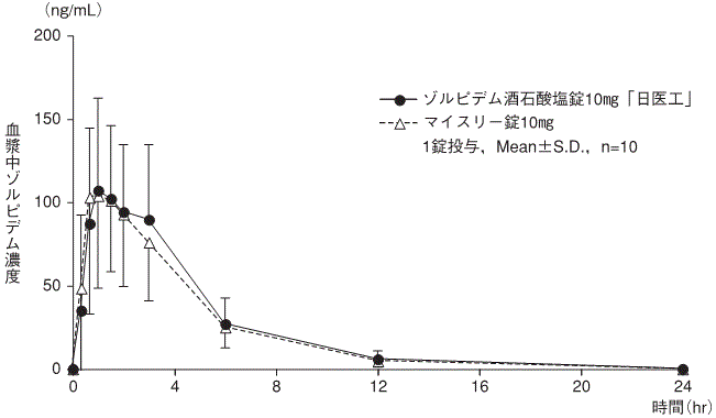 ゾルピデム酒石酸塩錠10mg「日医工」及びマイスリー錠10mgを、クロスオーバー法によりそれぞれ1錠(ゾルピデム酒石酸塩として10mg)健康成人男子に絶食単回経口投与して血漿中ゾルピデム濃度を測定し、得られた薬物動態パラメータ(AUC、Cmax)について90%信頼区間法にて統計解析を行った結果、log(0.8)~log(1.25)の範囲内であり、両剤の生物学的同等性が確認された2)。