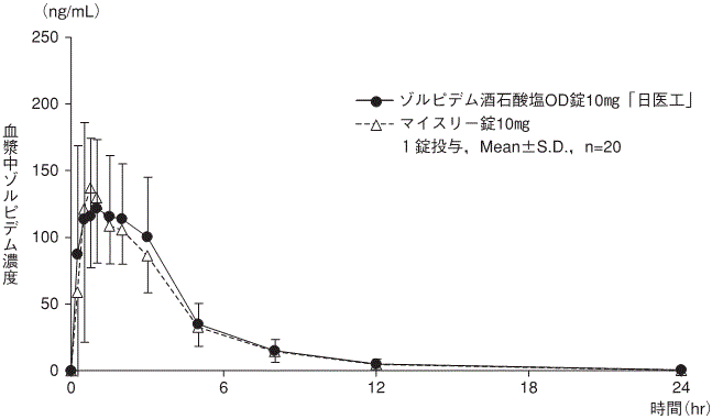 ゾルピデム酒石酸塩OD錠10mg「日医工」及びマイスリー錠10mgを、クロスオーバー法によりそれぞれ1錠(ゾルピデム酒石酸塩として10mg)健康成人男性に絶食単回経口投与(水で服用及び水なしで服用※)して血漿中ゾルピデム濃度を測定し、得られた薬物動態パラメータ(AUC、Cmax)について90%信頼区間法にて統計解析を行った結果、log(0.80)~log(1.25)の範囲内であり、両剤の生物学的同等性が確認された2)。