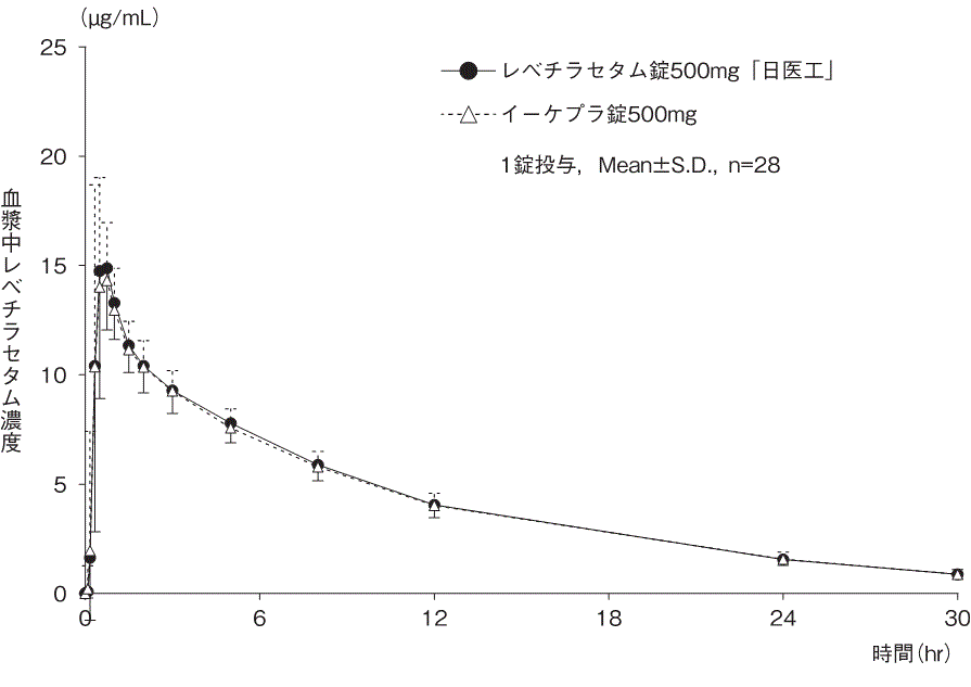 健康成人にレベチラセタム250、500、1000、1500、2000、3000、4000注1)、5000mg注1)(各投与量6例)を空腹時に単回経口投与したとき、すべての投与量でレベチラセタムの血漿中濃度は投与後ほぼ1時間に最高値を示し、消失半減期(t1/2)は投与量にかかわらず7~9時間であった3)。