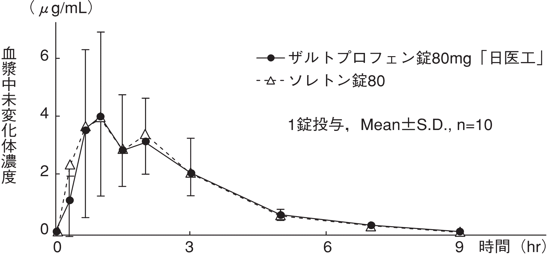 ザルトプロフェン錠80mg「日医工」とソレトン錠80を、クロスオーバー法によりそれぞれ1錠(ザルトプロフェンとして80mg)を健康成人男子に絶食単回経口投与して血漿中未変化体濃度を測定し、得られた薬物動態パラメータ(AUC、Cmax)について90%信頼区間法にて統計解析を行った結果、log(0.8)~log(1.25)の範囲内であり、両剤の生物学的同等性が確認された11)。