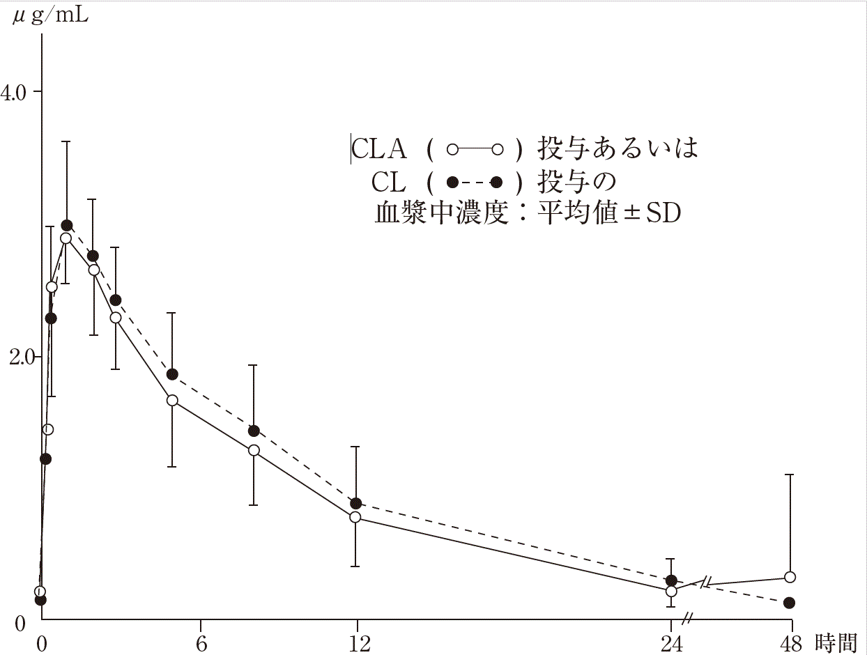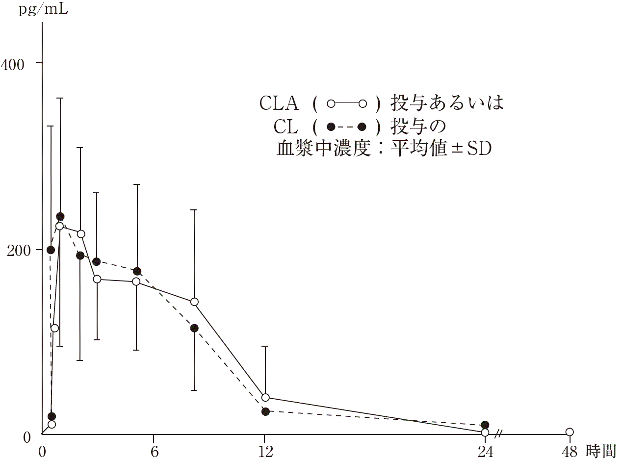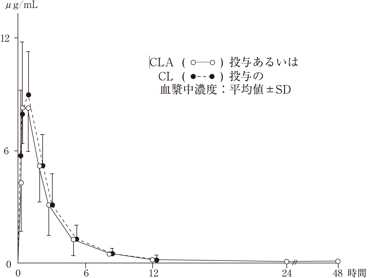 健康成人男性24名にクリアミン配合錠A1.0(CLA)2錠あるいはクリアミン配合錠S0.5(CL)4錠を単回経口投与した時の各成分の血漿中濃度を示す1)。