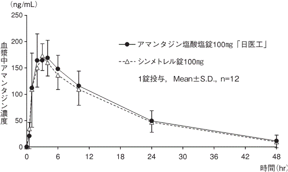 アマンタジン塩酸塩錠100mg「日医工」及びシンメトレル錠100mgを、クロスオーバー法によりそれぞれ1錠(アマンタジン塩酸塩として100mg)健康成人男子に絶食単回経口投与して血漿中アマンタジン濃度を測定し、得られた薬物動態パラメータ(AUC、Cmax)について統計解析を行った結果、両剤の生物学的同等性が確認された5)。