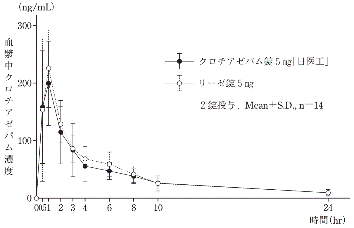 クロチアゼパム錠5mg「日医工」及びリーゼ錠5mgを、クロスオーバー法によりそれぞれ2錠(クロチアゼパムとして10mg)健康成人男子に絶食単回経口投与して血漿中クロチアゼパム濃度を測定し、得られた薬物動態パラメータ(AUC、Cmax)について統計解析を行った結果、両剤の生物学的同等性が確認された1)。