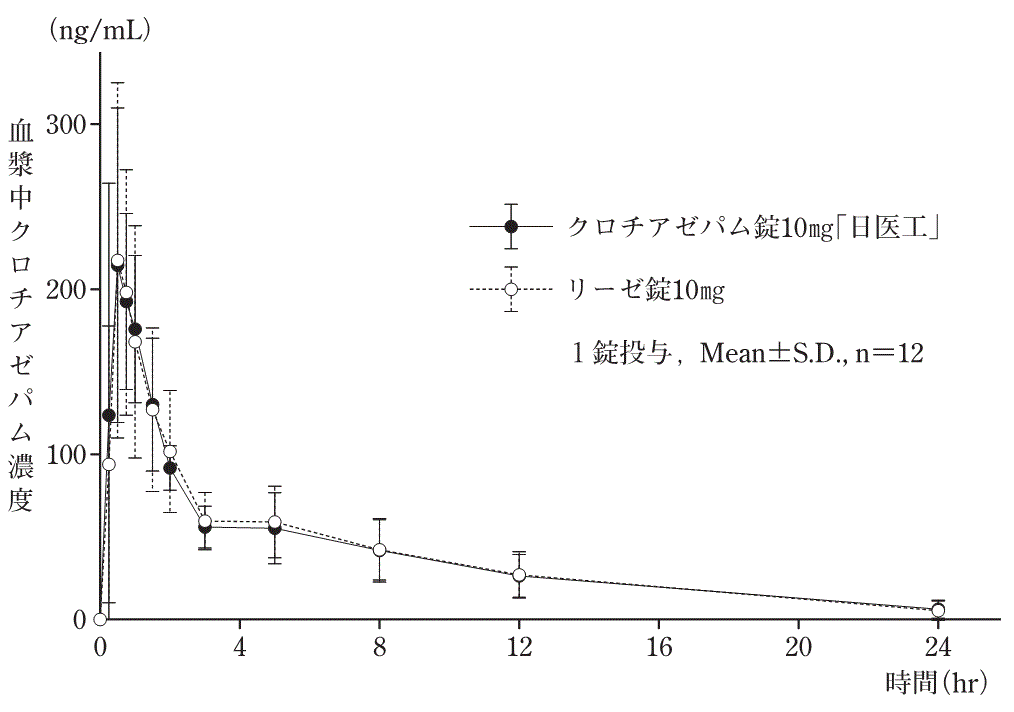 クロチアゼパム錠10mg「日医工」及びリーゼ錠10mgを、クロスオーバー法によりそれぞれ1錠(クロチアゼパムとして10mg)健康成人男子に絶食単回経口投与して血漿中クロチアゼパム濃度を測定し、得られた薬物動態パラメータ(AUC、Cmax)について統計解析を行った結果、両剤の生物学的同等性が確認された2)。