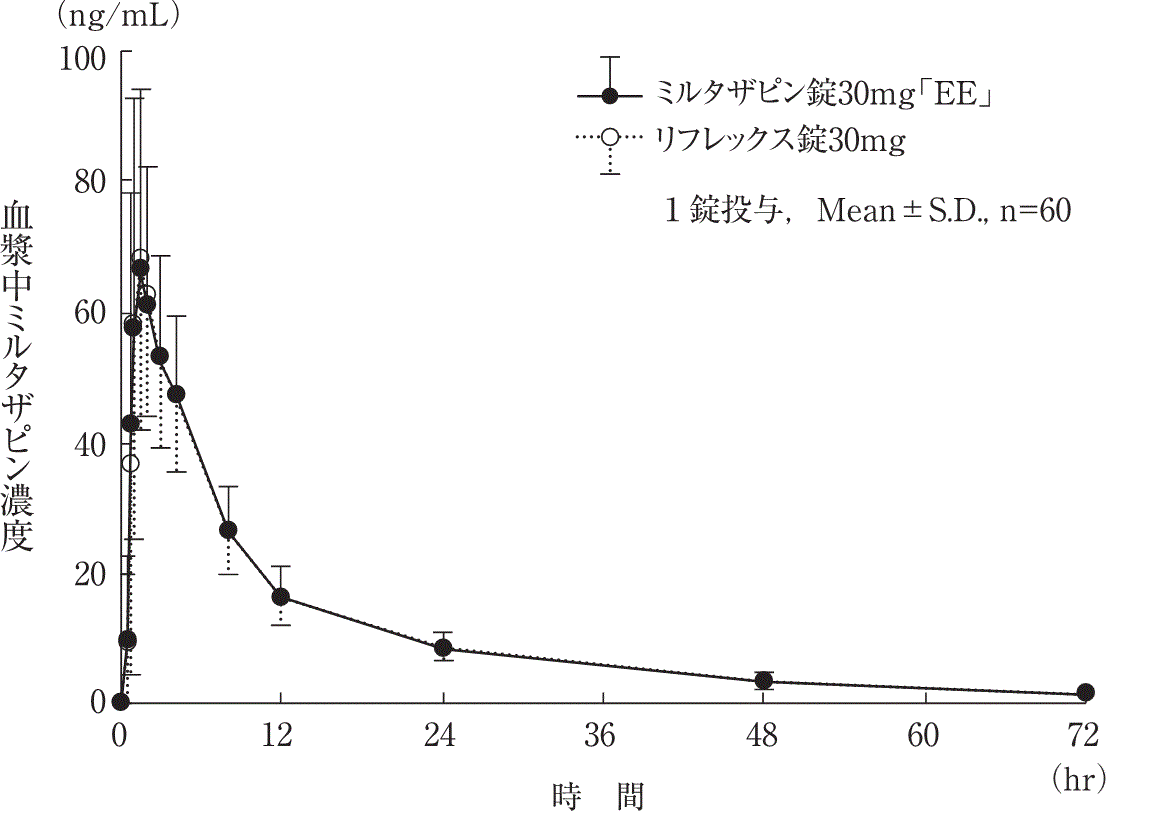 ミルタザピン錠15mg「EE」は、ミルタザピン錠30mg「EE」を標準製剤としたとき、溶出挙動が同等と判定され、生物学的に同等とみなされた21)。