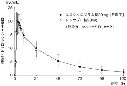 健康成人(CYP2C19のPM(Poor Metabolizer)及びEM(Extensive Metabolizer)各6例)に絶食下でエスシタロプラム5mg、10mg、20mgを単回経口投与した。CYP2C19EM群では投与後3.8~4.3時間で最高血漿中濃度(Cmax)に達し、消失半減期(t1/2)は24.6~27.7時間であり、Cmax及び血中濃度-時間曲線下面積(AUC)は投与量にほぼ比例して増加した。CYP2C19PM群における最高血漿中濃度到達時間及びCmaxはCYP2C19EM群と同程度であったが、AUC及びt1/2はCYP2C19EM群の約2倍であった4)。,,