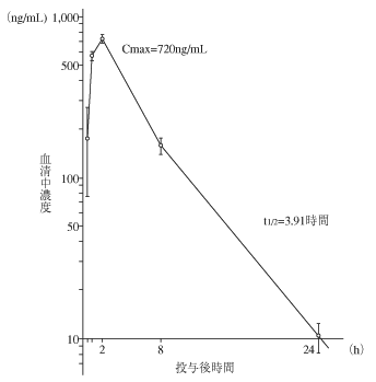 健康成人6例にチアプリド錠100mgを1回経口投与した場合注2)、速やかにかつほぼ完全に吸収され、血清中濃度は投与2時間後にピーク(720ng/mL)に達した後、消失半減期3.91時間で減少した1)。